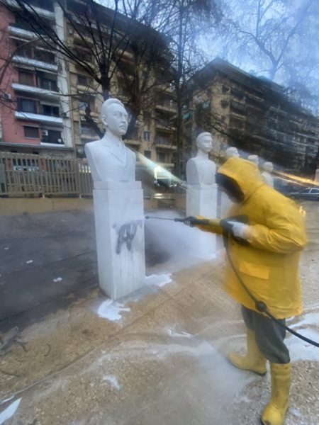 Σήμερα το πρωί συνεργείο της Υπηρεσίας Καθαριότητας του δήμου Θεσσαλονίκης καθάρισε τις προτομές από τα συνθήματα.