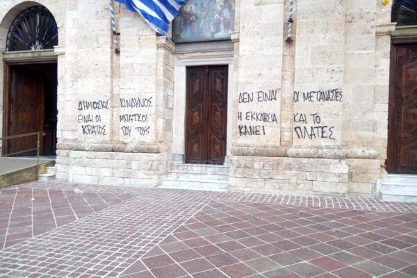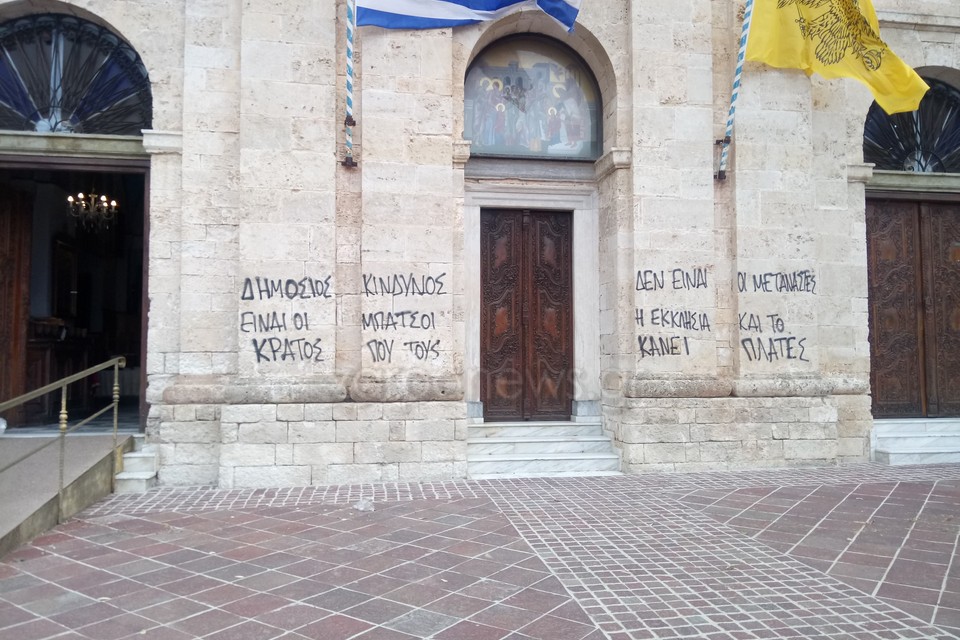 Τον εξωτερικό χώρο του Μητροπολιτικού Ναού των Εισοδίων της Θεοτόκου επέλεξαν για να κάνουν γνωστές τις θέσεις τους ανεγκέφαλοι που έγραψαν με σπρέι στην πρόσοψη της Εκκλησίας συνθήματα.