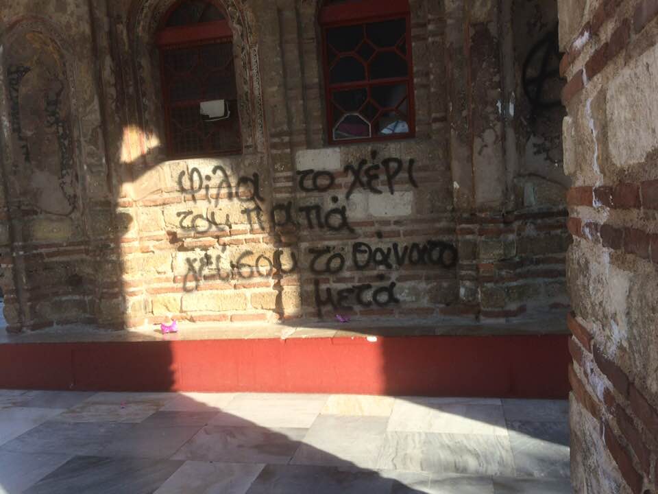 Όπως δημοσιεύεται στη σελίδα “Φίλοι του Ιστορικού Κέντρου της Θεσσαλονίκης” στο Facebook, άγνωστοι έγραψαν συνθήματα στον ιστορικό βυζαντινό ναό του Προφήτη Ηλία στην Άνω Πόλη της Θεσσαλονίκης.