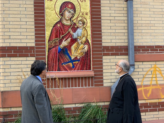 Ο ιερατικός προϊστάμενος της κοινότητας π. Γεώργιος Τσουκαλάς, είπε στον «Εθνικός Κήρυκα” πως «πρώτος είδε τη βεβήλωση ο Ιωάννης Μεκλής πρώην πρόεδρος της κοινότητας το πρωί της Κυριακής ο οποίος με ενημέρωσε. Δεν ξέρομε πότε έγινε ο βανδαλισμός» και συμπλήρωσε πως «δεν έχομε ιδέα ποίος ή ποίοι το έκαναν».