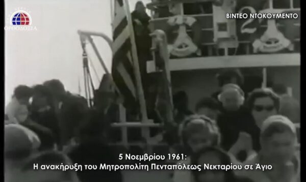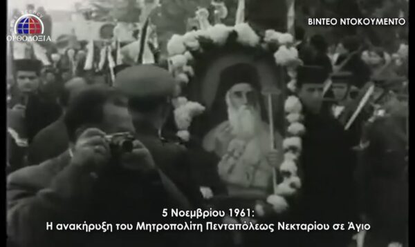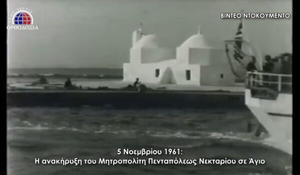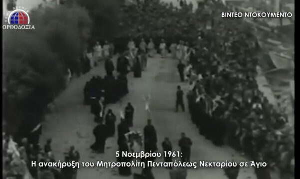Το σπάνιο βίντεο της Κινηματογραφικής Υπηρεσίας του Υπουργείου Εθνικής Αμύνης παρουσιάζει τις πανηγυρικές εκδηλώσεις στο νησί της Αίγινας τον Νοέμβριο του 1961, όταν ανακοινώθηκε η ανακήρυξη του ήδη Αγίου Νεκταρίου στις καρδιές των πιστών.