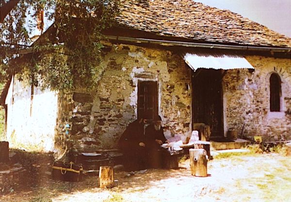 Ήδη βρισκόμαστε στην αυλή. Γενικότερα ο χώρος είναι πλαισιωμένος από πολλά δένδρα, καστανιές, λεύκες, κυπαρίσσια, θάμνους κ.ά. Καθόμαστε στο υπαίθριο αρχονταρίκι, όπως ο ίδιος ο Γέροντας το έλεγε, το οποίο ήταν ακριβώς μπροστά από το κελλί του.