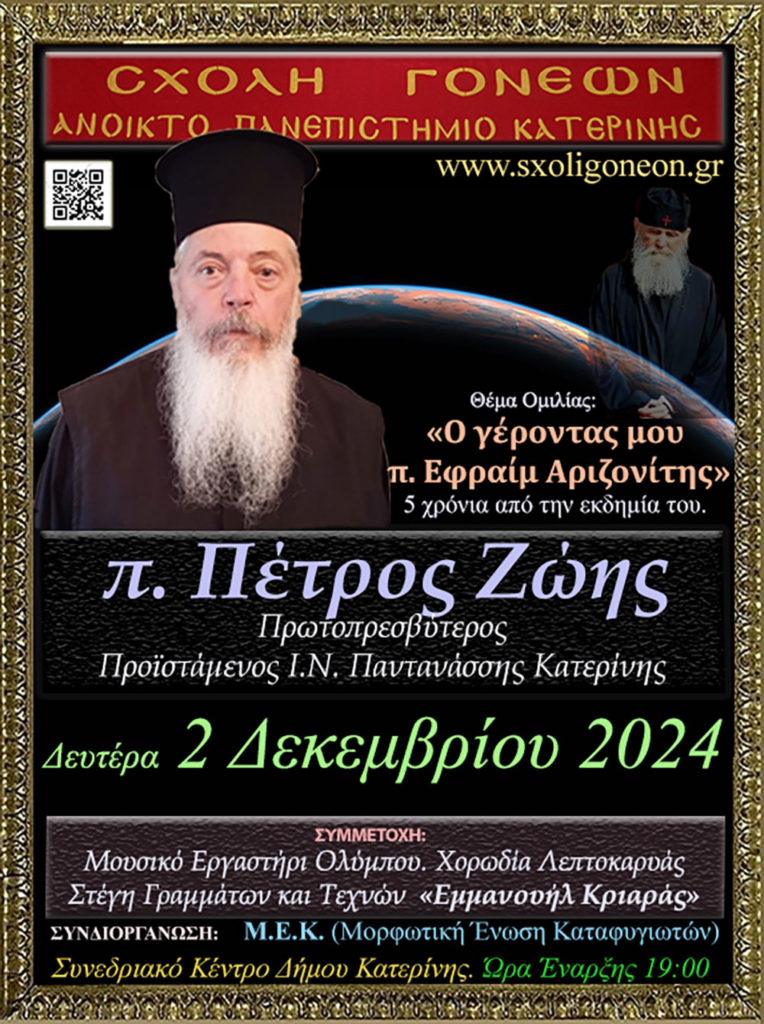 Η επόμενη εκδήλωση θα γίνει την Δευτέρα 2 Δεκεμβρίου 2024 με επίσημο ομιλητή και καλεσμένο τον πρωτοπρεσβύτερο π. Πέτρο Ζώη και θέμα: «Ο γέροντας μου π. Εφραίμ Αριζονίτης». 5 χρόνια από την εκδημία του.