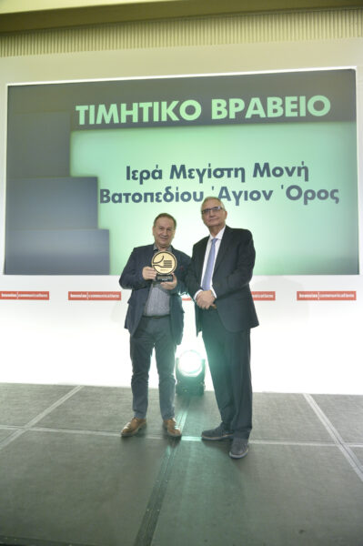 Η Τελετή Απονομής ξεκίνησε με την παράδοση του Τιμητικού Βραβείου, στην Ιερά Μεγίστη Μονή Βατοπεδίου, η οποία ξεχωρίζει για τα βιολογικά βραβευμένα προϊόντα της ακολουθώντας τις πλέον σύγχρονές καινοτόμες διαδικασίες. Το τιμητικό βραβείο παρέλαβε ο εκπρόσωπος της ΙΜΜ Βατοπαιδίου στην Τελετή Απονομής, Μανώλης Βαρσαμίδης.