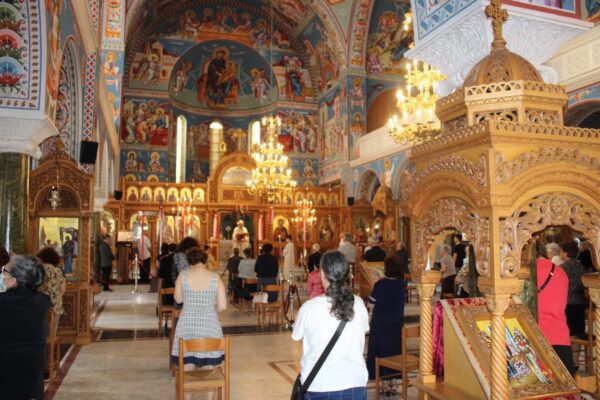 Οι πιστοί κρατώντας τις αποστάσεις υπομονετικά εντός κι εκτός του ναού συμμετείχαν στην Θεία Λειτουργία κοινωνώντας το Σώμα και το Αίμα του Κυρίου μας.