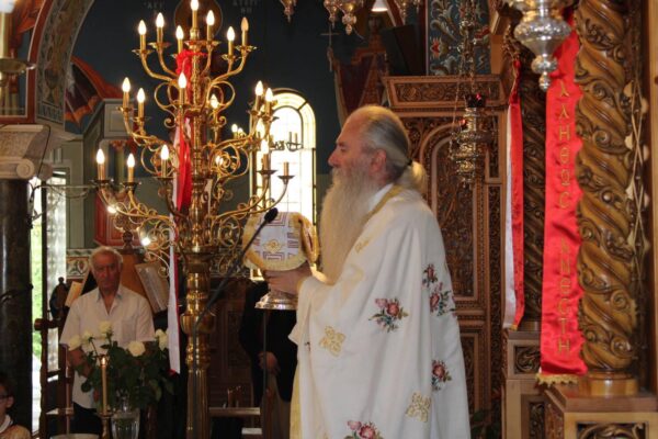 Οι πιστοί κρατώντας τις αποστάσεις υπομονετικά εντός κι εκτός του ναού συμμετείχαν στην Θεία Λειτουργία κοινωνώντας το Σώμα και το Αίμα του Κυρίου μας.