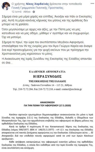 “Σήμερα είναι μια μέρα χαράς και ελπίδας. Άνοιξαν και πάλι οι Εκκλησίες μας. Αυτή τη μέρα κανένας κήρυκας του μίσους και της αμάθειας δεν μπορεί να τη χαλάσει. Όσοι μεγαλώσαμε με αρχες και αξίες, με την Πίστη μας να μας κατευθυνει και να μας οδηγει, μάθαμε ν’ αγαπάμε και να συγχωρούμε. Όχι να μισούμε. Σήμερα το πρωί, την ώρα του ανυπόστατου Μεγάλου Αφορισμού, επισκέφθηκα τον ΙΝ της ενορίας μου τον Άγιο Γεώργιο Καρέα και άναψα ένα κερί προσευχόμενος για την ψυχή εκείνων που με πρόσχημα την Χριστιανοσύνη μας κηρύσσουν το μίσος. Η Ανακοίνωση της Ιεράς Συνόδου της Εκκλησίας της Ελλάδος απαντάει σε όλα…”