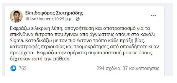 Πάντως, ο ίδιος έσπευσε να καταδικάσει τα έκτροπα στον τηλεοπτικό σταθμό Sigma με ανάρτηση στον προσωπικό λογαριασμό που διατηρεί στο Facebook, ήδη από το βράδυ της Κυριακής.