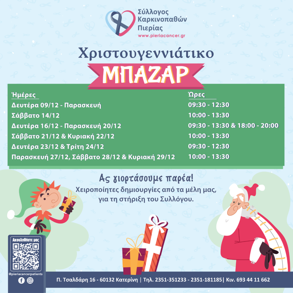 Ο Σύλλογος Καρκινοπαθών Πιερίας με αίσθημα αλληλεγγύης και ανθρωπιάς, διοργανώνει Χριστουγεννιάτικο Μπαζάρ χειροποίητων κατασκευών, και προσκαλεί όλους να επισκεφθούν το μπαζάρ και να βρουν μοναδικά, χειροποίητα δώρα, τα οποία θα γεμίσουν τις γιορτές με ζεστασιά και αγάπη.