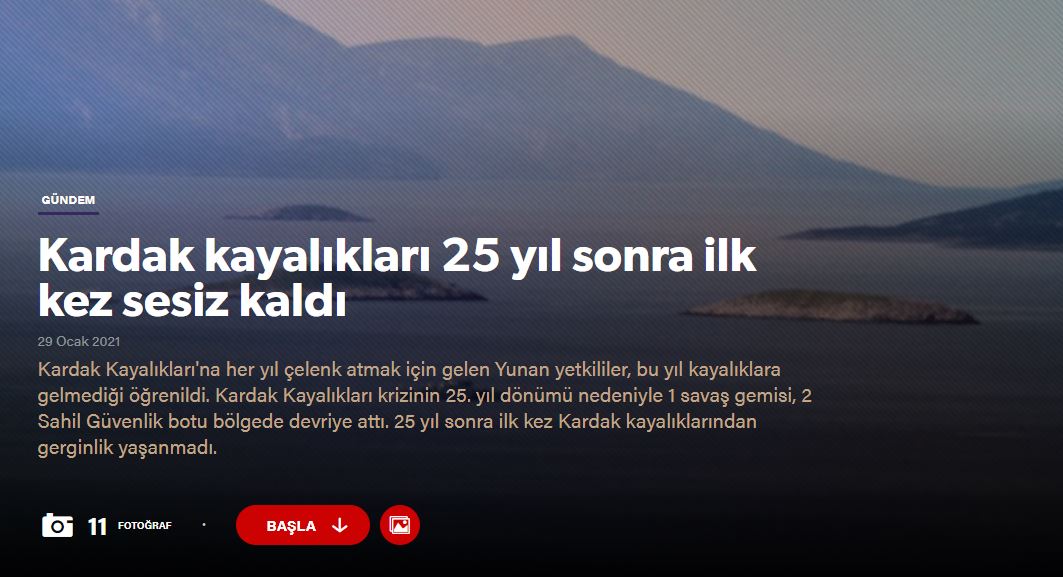 Σε άρθρο της με τίτλο: “Οι βραχονησίδες Καρντάκ (Ίμια) παρέμειναν σιωπηλές για πρώτη φορά μετά από 25 χρόνια”, η εφημερίδα τονίζει ότι σύμφωνα με τις πληροφορίες της φέτος οι ελληνικές αρχές δεν μετέβησαν στην περιοχή για να ρίξουν στεφάνια:
