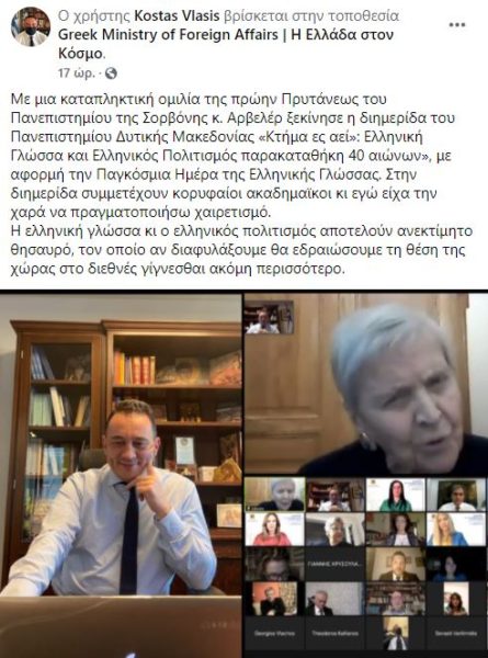 Την αξία τού να διδάσκονται τα παιδιά στο σχολείο την εξέλιξη της ελληνικής γλώσσας υπογράμμισε η Βυζαντινολόγος- Ιστορικός, Πρόεδρος του ΔΣ του Ευρωπαϊκού Πολιτιστικού Κέντρου των Δελφών και πρώην Πρύτανης της Σορβόννης, Ελένη Γλύκατζη- Αρβελέρ, μιλώντας στη διαδικτυακή διημερίδα «Κτήμα ες αεί: Ελληνική Γλώσσα και Ελληνικός Πολιτισμός παρακαταθήκη 40 αιώνων», που διοργάνωσαν το Πανεπιστήμιο Δυτικής Μακεδονίας και ομογενειακοί φορείς, στο πλαίσιο του εορτασμού της Παγκόσμιας Ημέρας της Ελληνικής Γλώσσας.