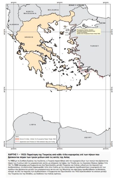 Παραίτηση της Τουρκίας από κάθε τίτλο κυριαρχίας επί των νήσων που βρίσκονται πέραν των τριών μιλίων από τις ακτές της Ασίας To 1923 με τη Συνθήκη Ειρήνης της Λωζάννης, η Τουρκία παραιτήθηκε από την κυριαρχία όλων των νησιών που βρίσκονται πέραν των 3 μιλίων από τις μικρασιατικές ακτές, με εξαίρεση την Ίμβρο, την Τένεδο και τις Λαγούσες Νήσους (άρθρα 12 & 16). Το 1932 υπεγράφη μια Συμφωνία και ένα Πρωτόκολλο, μεταξύ Τουρκίας και Ιταλίας, ειδικά για την περιοχή των ∆ωδεκανήσων, τα οποία είχαν παραχωρηθεί τότε στην Ιταλία, με την οποία αφενός προσδιορίστηκε η κυριαρχία επί των νησίδων που βρίσκονται μεταξύ των μικρασιατικών ακτών και της Μεγίστης και αφετέρου οριοθετήθηκαν τα θαλάσσια σύνορα σε όλη την περιοχή των ∆ωδεκανήσων. Η Συμφωνία και Πρωτόκολλο του 1932 εξακολουθούν να ισχύουν μεταξύ της Τουρκίας και της Ελλάδος, ως διαδόχου της Ιταλίας κράτους