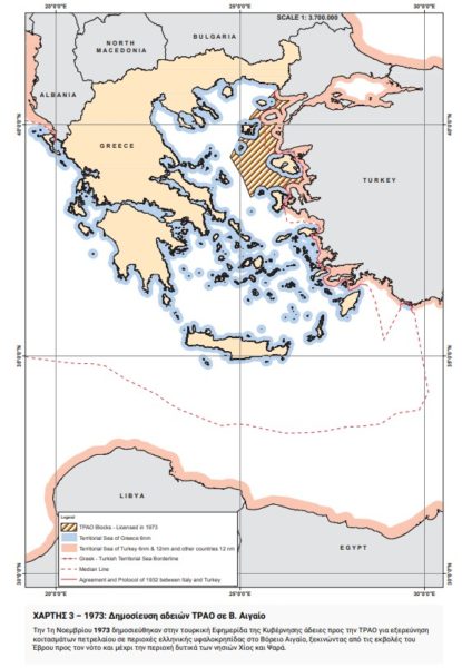 ∆ημοσίευση αδειών ΤΡΑΟ σε Β. Αιγαίο Την 1η Νοεμβρίου 1973 δημοσιεύθηκαν στην τουρκική Εφημερίδα της Κυβέρνησης άδειες προς την ΤΡΑΟ για εξερεύνηση κοιτασμάτων πετρελαίου σε περιοχές ελληνικής υφαλοκρηπίδας στο Βόρειο Αιγαίο, ξεκινώντας από τις εκβολές του Έβρου προς τον νότο και μέχρι την περιοχή δυτικά των νησιών Χίος και Ψαρά.
