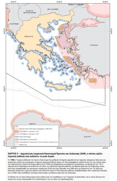 ∆ημοσίευση τουρκικού Κανονισμού Έρευνας και ∆ιάσωσης (SAR), ο οποίος ορίζει περιοχή ευθύνης που καλύπτει το μισό Αιγαίο Το 1988 η Τουρκία εξέδωσε τον πρώτο Κανονισμό που ρύθμιζε ζητήματα αρμοδιότητας παροχής υπηρεσιών Έρευνας και ∆ιάσωσης ορίζοντας μονομερώς τουρκική περιοχή ευθύνης μέχρι τον 25ο μεσημβρινό, καλύπτοντας επί της ουσίας όλην την περιοχή στην οποία είχε δώσει άδεια στην ΤΡΑΟ για εξερεύνηση κοιτασμάτων πετρελαίου, τη δεκαετία του ΄70. Η περιοχή αυτή παρανόμως επικαλύπτει όχι μόνο την ελληνική περιοχή ευθύνης για θέματα έρευνας και διάσωσης, όπως αυτή έχει αποφασισθεί με περιοχικές συμφωνίες ICAO και έχει δηλωθεί στον ΙΜΟ από την δεκαετία του ‘70, αλλά και περιοχές ελληνικών χωρικών υδάτων και ελληνικά νησιά. Η ίδια περιοχή ευθύνης επιβεβαιώθηκε από τουρκικής πλευράς και το 2001 όπου εκδόθηκε νεότερος Κανονισμός για θέματα έρευνας και διάσωσης. Η έκδοση του εν λόγω Κανονισμού ήταν ενδεικτική των προθέσεων της Τουρκίας να αποκτήσει τον εν γένει έλεγχο στο Αιγαίο και να μην περιορισθεί στις διεκδικήσεις της ως προς την υφαλοκρηπίδα
