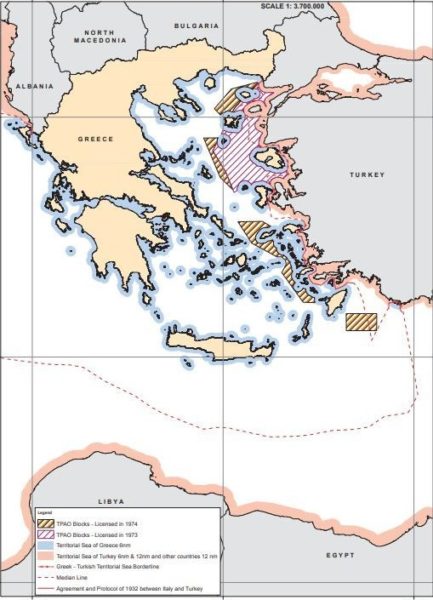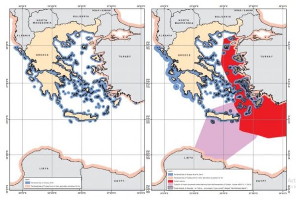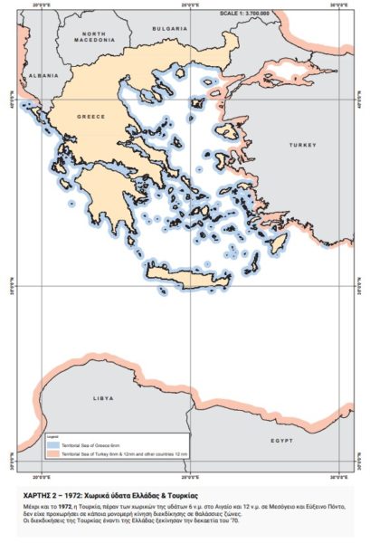 Χωρικά ύδατα Ελλάδας & Τουρκίας Μέχρι και το 1972, η Τουρκία, πέραν των χωρικών της υδάτων 6 ν.μ. στο Αιγαίο και 12 ν.μ. σε Μεσόγειο και Εύξεινο Πόντο, δεν είχε προχωρήσει σε κάποια μονομερή κίνηση διεκδίκησης σε θαλάσσιες ζώνες. Οι διεκδικήσεις της Τουρκίας έναντι της Ελλάδας ξεκίνησαν την δεκαετία του ‘70.