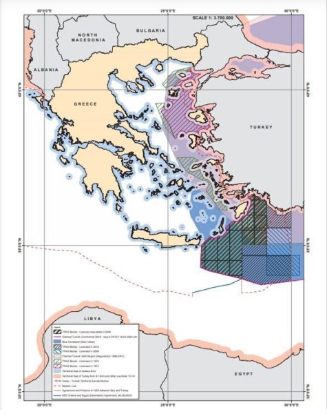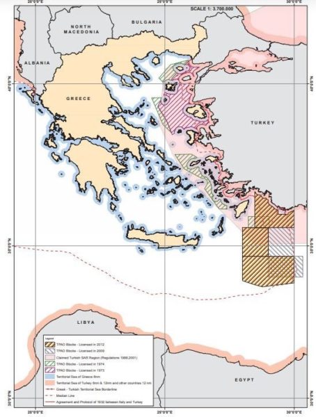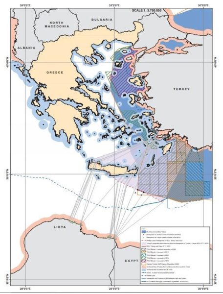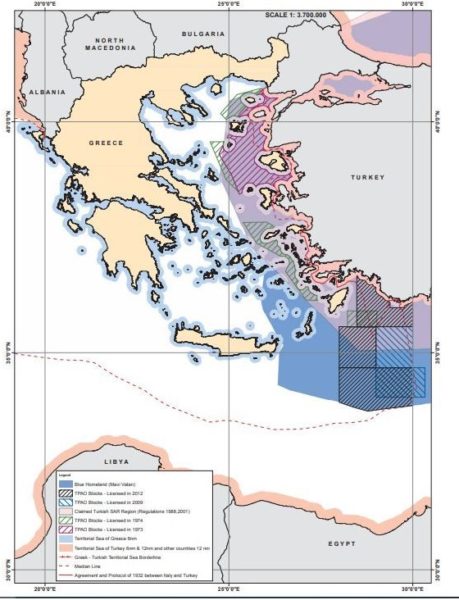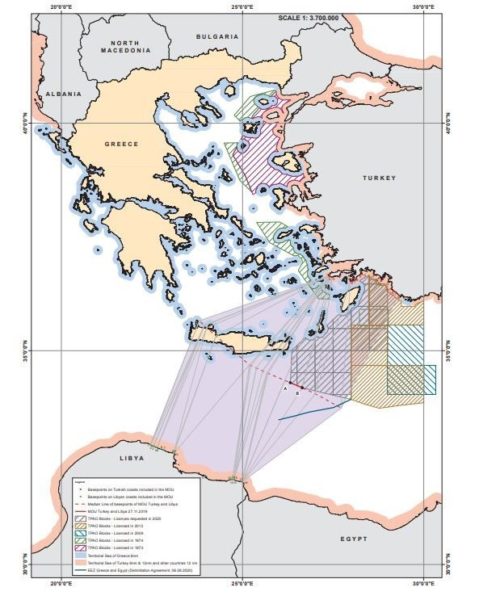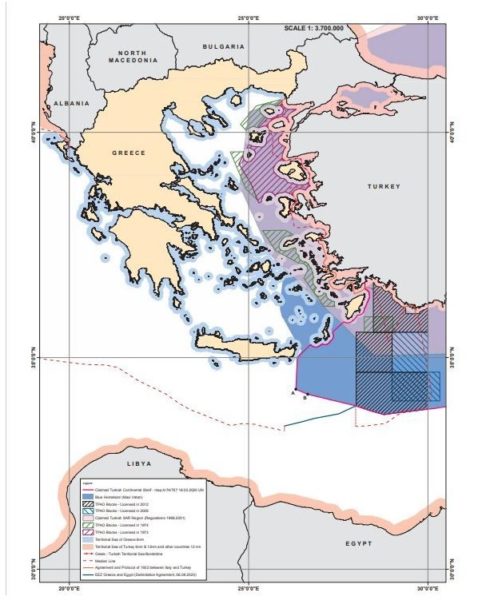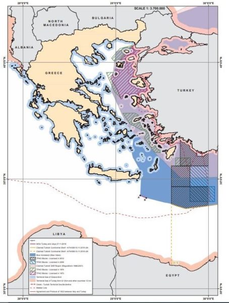 Κατάθεση στον ΟΗΕ χάρτη με τα διεκδικούμενα όρια τουρκικής υφαλοκρηπίδας στην Ανατολική Μεσόγειο Τον Μάρτιο του 2020 (18.3.2020), η Τουρκία καταθέτει στα ΗΕ χάρτη στον οποίο εμφαίνεται, πέρα από την οριογραμμή του παράνομου τουρκολυβικού Μνημονίου, ολόκληρη η περιοχή που διεκδικεί στην Ανατολική Μεσόγειο. Τα εξωτερικά όρια της διεκδικούμενης περιοχής αγγίζουν τα εξωτερικά όρια των χωρικών υδάτων της Κρήτης, εφάπτονται με τα εξωτερικά όρια των χωρικών υδάτων των νησιών Κάσσου και Καρπάθου και εισέρχονται σε ελληνικά χωρικά ύδατα στην περιοχή της Ρόδου (βραχονησίδες Χήνα & Παξιμάδα).