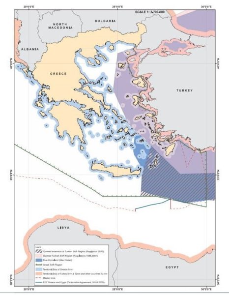 Επέκταση της διεκδικούμενης τουρκικής περιοχής ευθύνης για Έρευνα & ∆ιάσωση Τον Οκτώβριο του 2020, η Τουρκία εκδίδει νέο Κανονισμό για ζητήματα έρευνας και διάσωσης, με τον οποίο επεκτείνει, κυρίως στην Ανατολική Μεσόγειο, την διεκδικούμενη περιοχή αρμοδιότητάς της, ώστε αυτή να ταυτίζεται με τα όρια της “Γαλάζιας Πατρίδας”.