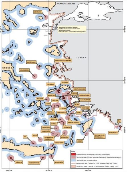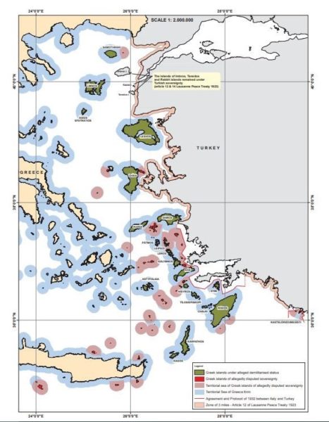 Τα σύμφωνα με την τουρκική θεωρία αποστρατιωτικοποιημένα ελληνικά νησιά Η Τουρκία, στο πλαίσιο της γνωστής πολιτικής της για να αποκτήσει τον εν γένει έλεγχο του μισού Αιγαίου, προώθησε το 2021, με την κατάθεση σχετικών επιστολών της στον ΓΓΗΕ, μία καινοφανή θεωρία που συνδέει την από δεκαετίες αξίωσή της για πλήρη αποστρατιωτικοποίηση των νησιών του Βορείου και Ανατολικού Αιγαίου και των ∆ωδεκανήσων, με την ελληνική κυριαρχία επ’ αυτών και το δικαίωμα της Ελλάδας να επικαλείται τόσο την ίδια την κυριαρχία όσο και τα δικαιώματα που απορρέουν από αυτήν ως προς την οριοθέτηση των θαλασσίων ζωνών. Όπως φαίνεται από τον χάρτη, ο οποίος παρουσιάζει τόσο τα δήθεν αποστρατιωτικοποιημένα νησιά όσο και κάποιες από τις δήθεν “γκρίζες ζώνες” η Τουρκία επιδιώκει να “ακυρώσει”, νομικά, την ύπαρξη όλων των ελληνικών νησιών από τον 25 ο Μεσημβρινό και ανατολικά.