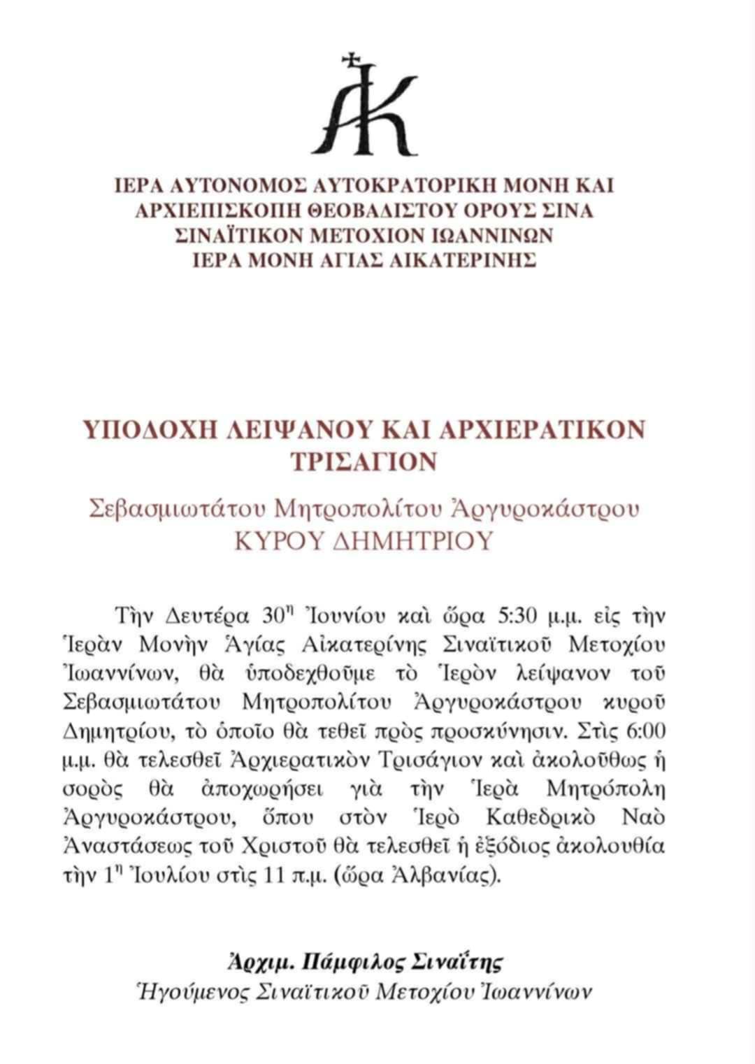Την Δευτέρα 30 Ιουνίου καὶ ὥρα 5:30 μ.μ. εἰς τὴν Ἱερὰν Μονὴν Ἁγίας Αικατερίνης Σιναϊτικοῦ Μετοχίου Ἰωαννίνων, θὰ ὑποδεχθοῦμε τὸ Ἱερὸν λείψανον τοῦ Σεβασμιωτάτου Μητροπολίτου Αργυροκάστρου κυροῦ Δημητρίου, τὸ ὁποῖο θὰ τεθεῖ πρὸς προσκύνησιν.