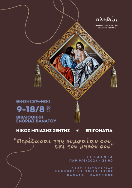 Το Μορφωτικό Κέντρο Λόγου και Τέχνης Βανάτου “Αληθώς” παρουσιάζει Έκθεση αγιογραφημένων Επιγονατίων του ζακυνθίου αγιογράφου και ζωγράφου ΝΙΚΟΥ ΜΠΙΑΖΗ-ΣΕΝΤΗ, με τον γενικότερο τίτλο: “Περίζωσαι την ρομφαίαν σου επί τον μηρόν σου”.