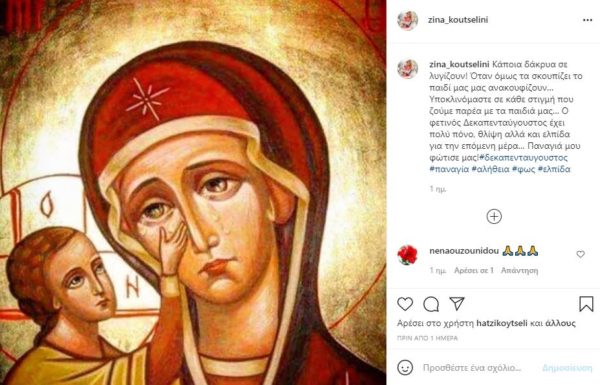 Η γνωστή παρουσιάστρια Ζήνα Κουτσελίνη με ανάρτησή της στα μέσα κοινωνικής δικτύωσης αναφέρεται στον φετινό Δεκαπενταύγουστο και σημειώνει ότι “έχει πολύ πόνο, θλίψη” όμως προσθέτει ότι υπάρχει “ελπίδα για την επόμενη μέρα” ενώ επικαλείται την Παναγία για φώτιση.