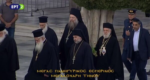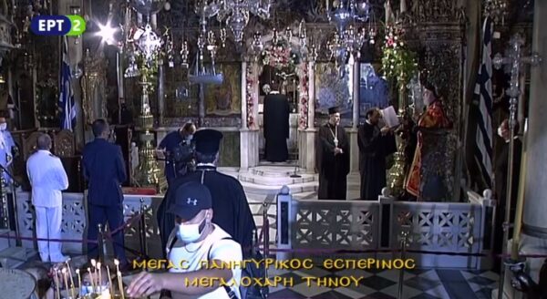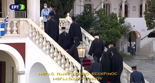 Ιερός Πανηγυρικός Εσπερινός στη Μεγαλόχαρη Τήνου, κατά την εσπέρα της 14ης Αυγούστου 2020. ΠΑΡΑΚΟΛΟΥΘΗΣΤΕ