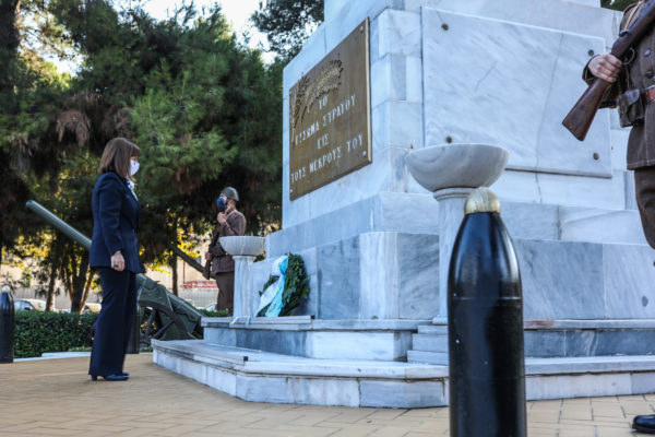 Νωρίτερα, η Πρόεδρος της Δημοκρατίας κατέθεσε στεφάνι στο μνημείο Ηρώων του Γ’ Σώματος Στρατού. Στο τέλος της παρέλασης, η κα Σακελλαροπούλου προέβη σε μια λιτή ανακοίνωση, χαρακτηρίζοντας το Έπος του ’40 ως μια «στιγμή τιμής και περηφάνειας για το έθνος. Μια ημέρα δόξας για τον ελληνικό λαό, που αντιστάθηκε γενναία στη φασιστική εισβολή», ενώ είπε πως αυτό μας διδάσκει πόσα μπορούμε να επιτύχουμε όταν είμαστε ενωμένοι». Τέλος, εξέφρασε την ευγνωμοσύνη της στις Ένοπλες Δυνάμεις για ό,τι μας προσφέρουν.