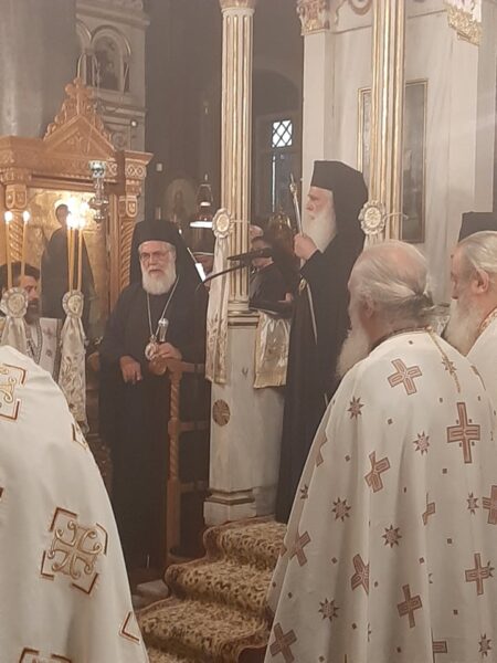 Όπως το πρωί στο Αμπελοχώρι Θηβών, έτσι και στον Εσπερινό παρέστη, συμπροσευχόμενος εκ του Ιερού Βήματος, ο Μακαριώτατος Αρχιεπίσκοπος Αθηνών και Πάσης Ελλάδος κ.κ. Ιερώνυμος. Μάλιστα, κατά την άφιξή του στον Ιερό Ναό, πιστοί προσήλθαν για να λάβουν την ευχή του.