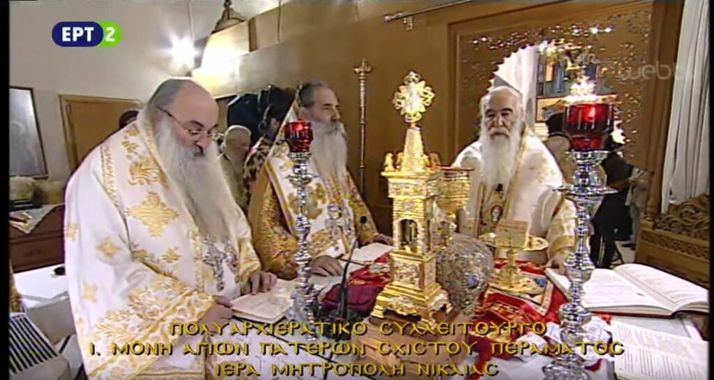 Παρουσία πλήθους κόσμου και σε κατανυκτικό κλίμα τελείται αυτή την ώρα το Πολυαρχιερατικό Συλλείτουργο στην Ιερά Μονή Αγίων Πατέρων Σχιστού Περάματος της Ιεράς Μητροπόλεως Νικαίας. Προεξάρχει ο Σεβασμιώτατος Μητροπολίτης Νικαίας κ. Αλέξιος, ενώ συλλειτουργούν οι Σεβασμιώτατοι Μητροπολίτες Πειραιώς Σεραφείμ, Θηβών και Λεβαδείας Γεώργιος καθώς και οι Επίσκοποι, Χριστιανουπόλεως Προκόπιος και Ευρίπου Χρυσόστομος.