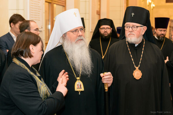 В заключительном слове протоиерей Владимир Воробьев поблагодарил Блаженнейшего Митрополита Тихона и подарил ему на молитвенную память икону его небесного покровителя святого Патриарха Тихона, написанную на факультете церковных художеств университета, а также изданные в ПСТГУ книги протопресвитеров Александра Шмемана и Иоанна Мейендорфа. В свою очередь Предстоятель Православной Церкви в Америке преподнес отцу ректору на память крест с украшениями.