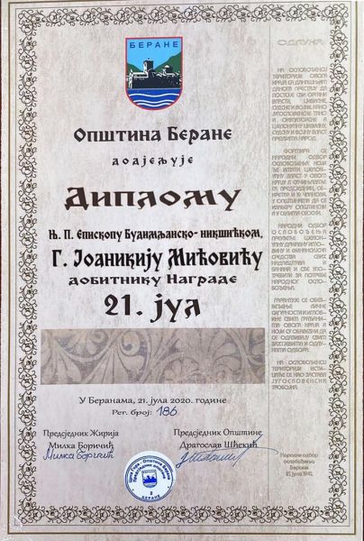 Предсједник општине Беране Драгослав Шћекић уручио је данас, уз поштовање епидемиолошких мјера, Њ. П. Епископу будимљанско-никшићком и администратору Митрополије црногорско-приморске, г. Јоаникију највише општинско признање – награду „21. јул“.