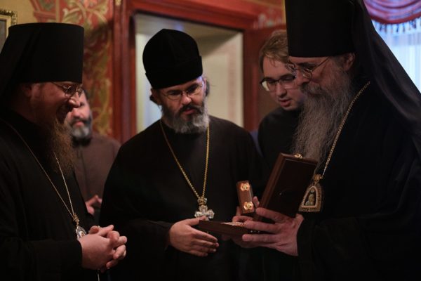 От лица наместника Лавры епископа Сергиево-Посадского и Дмитриевского Фомы игумен Филипп (Ельшин) подарил епископу Алексию панагию.