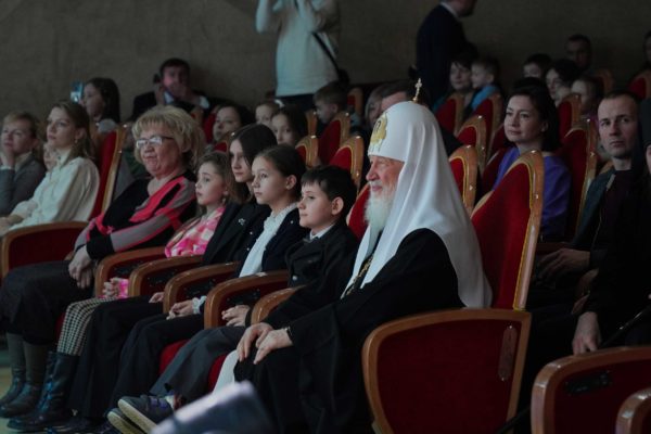 В фойе Зала церковных соборов Предстоятеля Русской Православной Церкви встречали ученики воскресной школы Храма Христа Спасителя, вместе с ними Святейший Владыка прошел в зал и занял место в первом ряду.