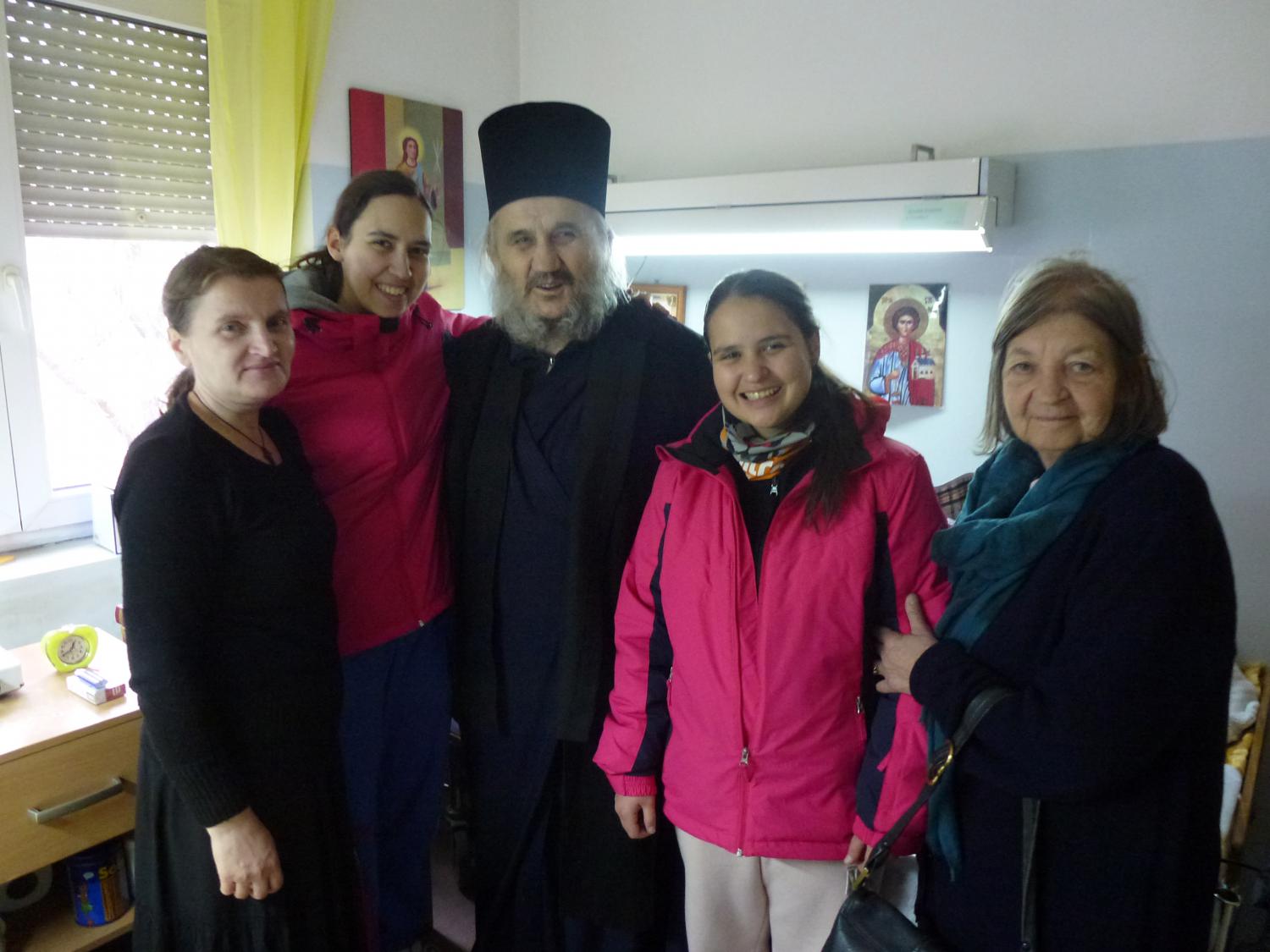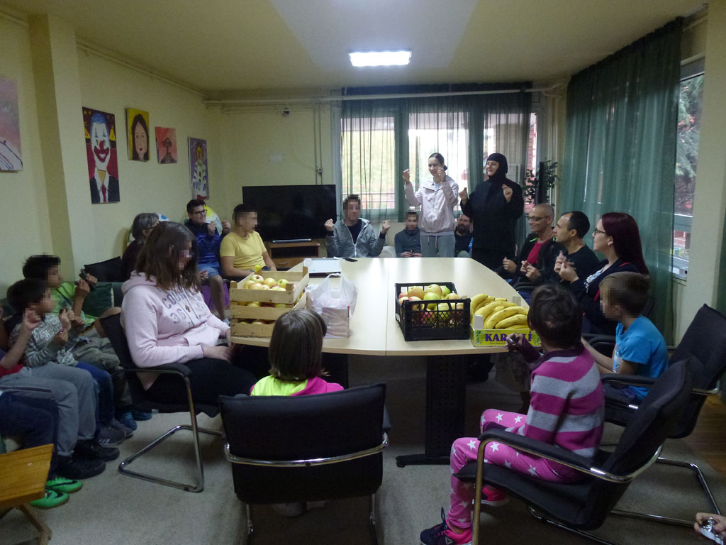 Долазак волонтера био је најављен и у дворишту Дома дочекала их је стара познаница Сандра која пише песме. Две дежурне васпитачице су врло љубазно примиле госте и позвале децу да дођу у дневни боравак где су им поделили воће, слаткише и „Православље“, „Православни мисионар“ и мале молитвенике. У Дому борави тренутно око четрдесеторо деце, а у Прихватилишту четрнесторо.