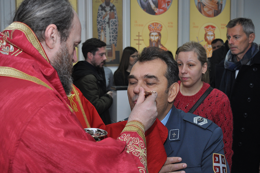 Свету Литургију је служио Његово Преосвештенство Епископ ремезијански г. Стефан, викар Патријарха српског, са војним свештеницима Владимиром Благојевићем и Немањом Петровићем и протођаконом Зораном Николић, у присуству команданта генерала-мајора Душка Жарковића, начелника Штаба РВ и ПВО бригадног генерала Александра Бјелића и припадника Команде РВ и ПВО.