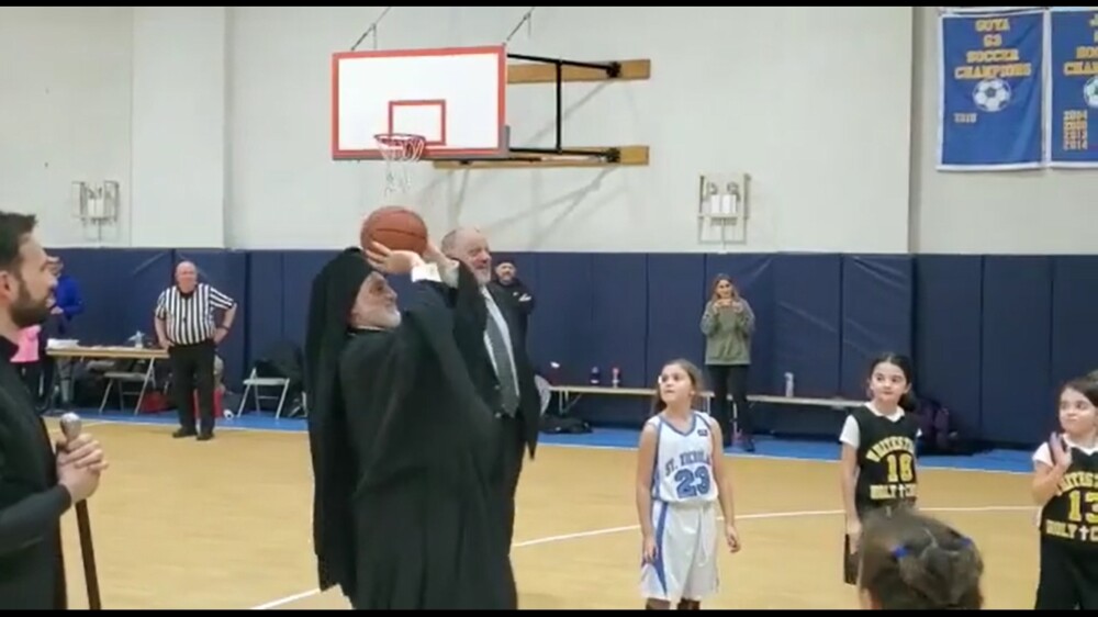 Архиепископът на Америка г-н Елпидофор посети училище за малки деца по време на часа им по физическо възпитание, когато играт баскетбол.