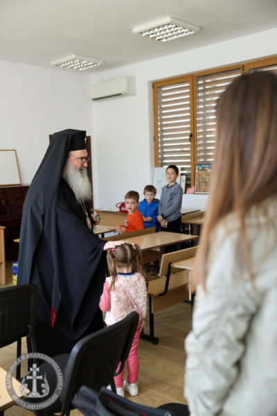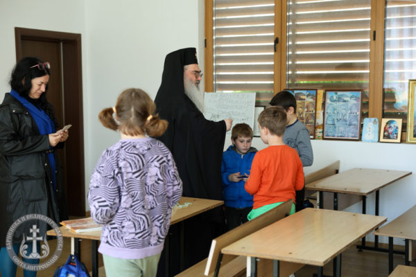 След края на богослужението Архиереят посети неделното училище при храма, където се срещна с част от децата на енорията.