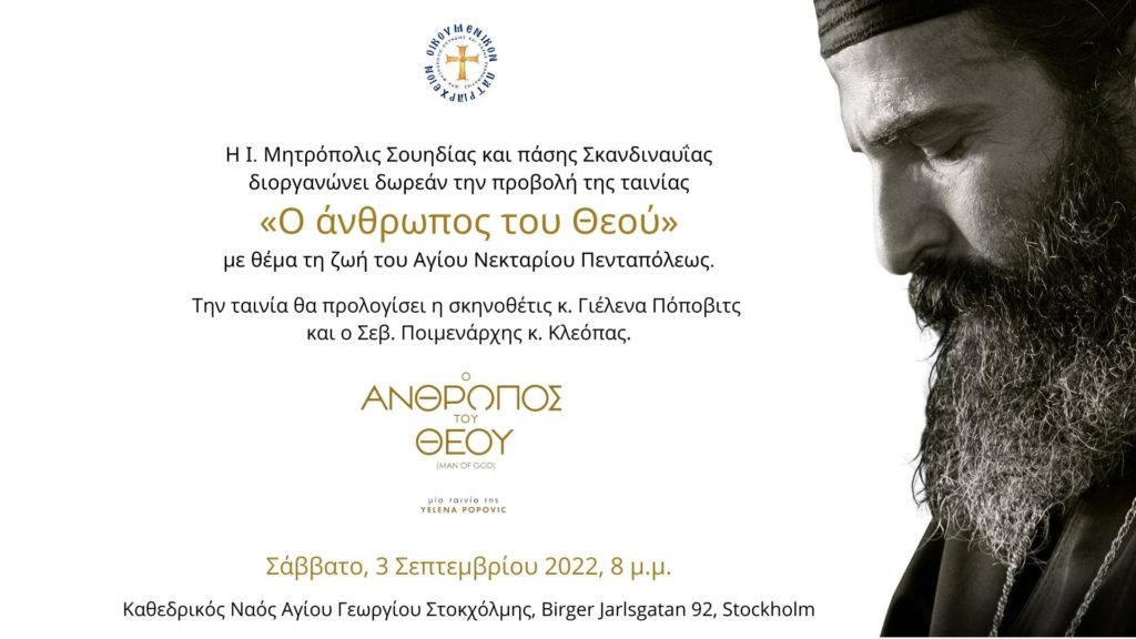 В субботу 3 сентября в 20:00 Митрополия Шведская организует бесплатный показ фильма “Человек Божий” на тему жития святого Нектария Пентапольского, который спродюссирован компанией Simeon Entertainment, View Master Films που έγινε σε συνεργασία με την Ιερά Μεγίστη Μονή Βατοπαιδίου и институтом святого преподобного Максима Грека, показ пройдет в кафедральном оборе святого Георгия в Стокгольме.