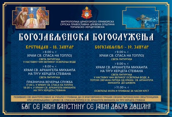 Црквена општина топаљско-херцегновска и ове године на празник Богојављење, организује саборна празнична богослужења, чин освећења мора и Богојављенско пливање за Часним крстом, које ће се одржати у недјељу 19. јануара, након Свете литургије на Шкверу у Херцег Новом, са почетком у 11 часова.