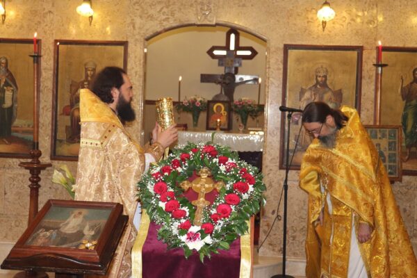 На сугубой ектении прозвучали прошения о единстве Православной Церкви и сохранении Церкви от разделений и расколов. После сугубой ектении владыка Феофилакт вознес молитву о мире на Украине. В конце Литургии было совершено славление Честному и Животворящему Кресту Господню.