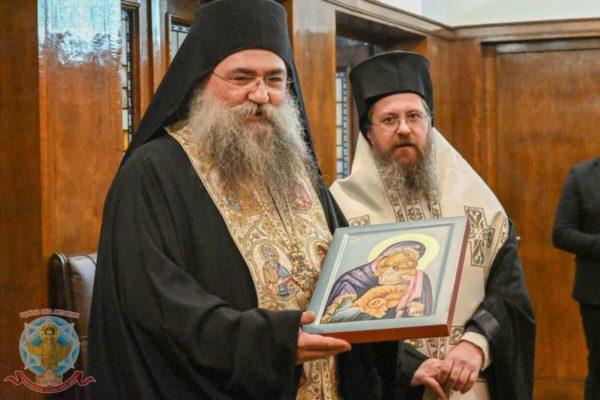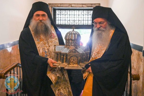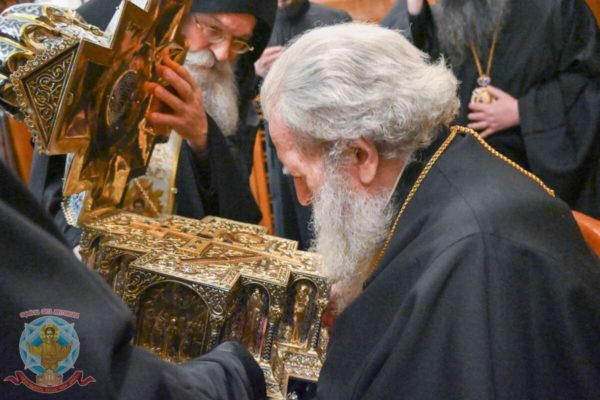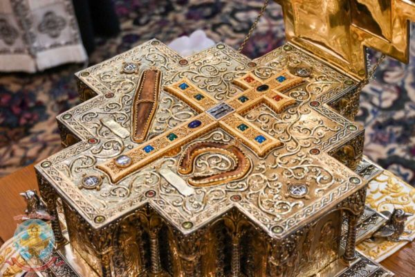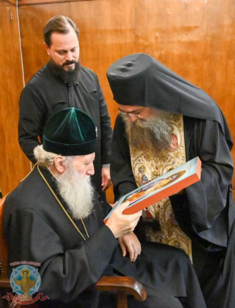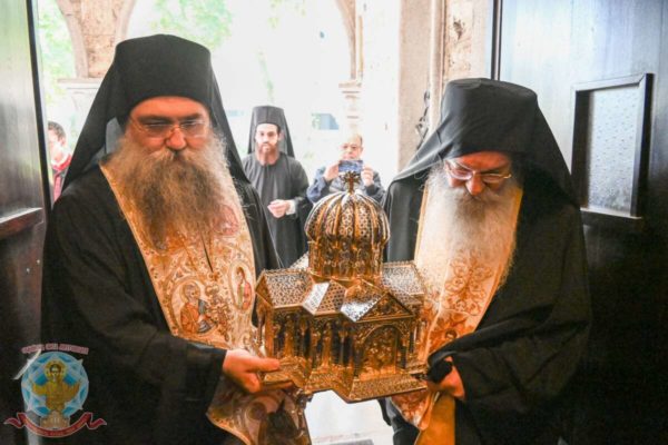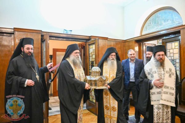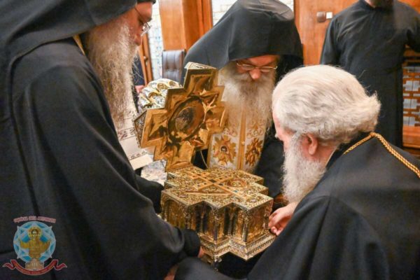 Светейшият патриарх приветства гостите и като се поклони благоговейно на светите мощите и на частицата от Светия Кръст Господен, отправи първосветителския си благослов и молитвени благопожелания към игумена на Светогорския манастир Есфигмен архимандрит Вартоломей и манастирското братство. Той от своя страна подари на Негово Светейшество икона на Света Богородица „Умиление“.