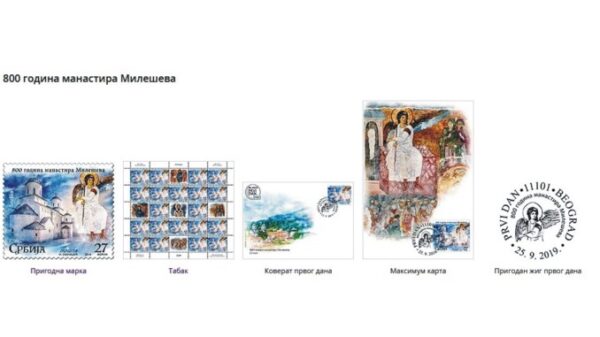 Пошта Србије издала је пригодну поштанску марку поводом обележавања 800 година манастира Милешева, номиналне вредности 27 динара. Поштанска марка, уз табак, коверат, максимум карту и пригодни жиг, пуштена је у оптицај 25. септембра. Штампана је у тиражу од 25.000 примерака и шалтерским табацима од 20 комада. Мотив на марки су манастир Милешева и Бели анђео, детаљ фреске Мироносице на гробу Христовом.