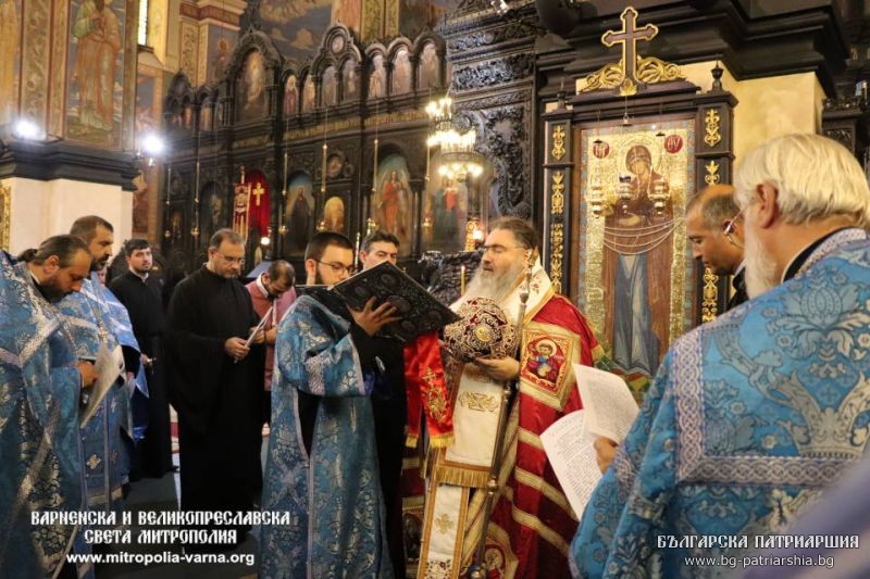 В богослужението съслужиха председателите на варненските храмове и духовници от града. Сборна група с диригент Тодор Тодоров изпълни песнопенията на вечернята. Молебният канон на Пресвета Богородица бе изпят антифонно от Негово Високопреосвещенство и от присъстващите отци и певци. Прозвуча евангелието според свети апостол и евангелист Лука (Лк 1:39-49; 56). След края на канона Архиереят внесе честния Кръст в светия олтар. Той бе изнесен сутринта за поклонение и престоя в корабната част на храма през целия ден, тъй като чествахме празника Произхождение на светия Кръст.