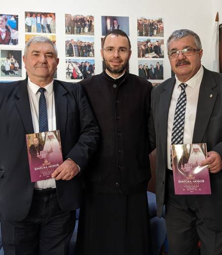 О. Кирил с Георги Тоадер, председател на сдружение „Българска радост“ на българите от общ. Бълени Сърби (отляво), и с Мариан Костаке, председател на сдружение „Заедно“ на българите от Търговище: