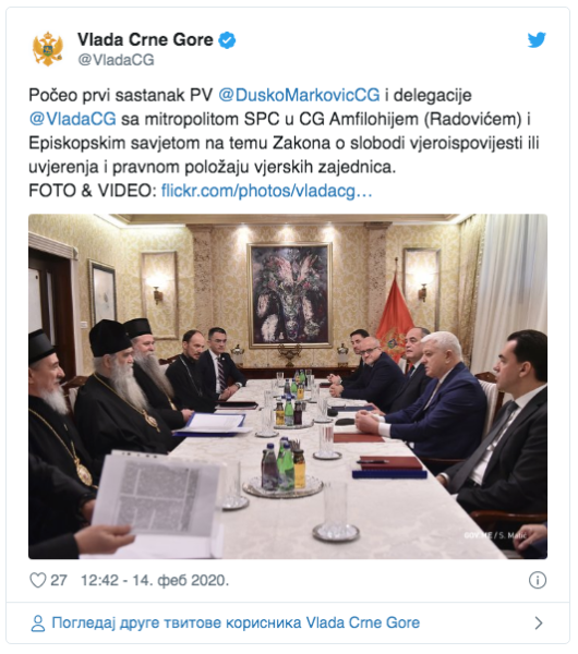 14/02/2020 15/02/2020 Састанак премијера Црне Горе Душка Марковића и митрополита црногорско-приморског Амфилохија завршен је после пет сати.    Састанак је одржан у вили „Горица“ у Подгорици. Разговори су почели око 11 сати, а разговарало се о спорном Закону о слободи вероисповести. ​Делегације Владе Црне Горе и Епископског савета разговарале су о спорном Закону због ког грађани...