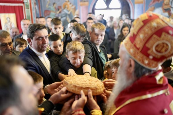 Још бих рекао да сви ми доживљавамо да је света Литургија заиста предукус Царства Небеског на земљи. Ту су са нама анђели и сви свети, које смо насликали на фрескама, наши заштитници, наше крсне славе и сва пуноћа Цркве Божје. Међутим, света Литургија је, браћо и сестре, крстоваскрсна борба сваког човека када улази у свети храм. Он долази као стари човек, са својим слабостима и искушењима, али у Цркви се бори за Христа у себи, за вечни живот, за Новог Адама у себи. Бори се да постане нова твар, нови човек, обожен благодаћу Божјом. Да постане син или кћи Божја по благодати. То је призив, то је Литургија, то је свето Причешће. Зато је Литургија духовно Косово поље, борба у којој имамо Крст, али и Васкрсење. Имамо вход на Литургији који символише погреб и страдање Христово, али када свештеници призивају Духа Светога, Дарови се претварају у Тело и Крв Христову. Тада се причешћујемо живим и Васкрслим Христом, доживљавајући тајну нашег и свеопштег васкрсења. Зато је наш народ живео Литургијом и борио се за Литургију. Народ је градио светиње у својим селима, јер село које нема цркву је као човек без личне карте – не зна се куда иде, чему стреми. Зато је данас благословено што смо овде заједно, са нашом децом, малим светосавцима и православцима, да се Богу молимо и да следимо освештан пут Немањића и наших светих предака, како је говорио наш свети патријарх Павле. Ових дана певамо у славу Божју и прослављамо светитеље. Зашто то чинимо? Као што сликамо фреске и иконе у црквама и манастирима да бисмо подражавали живот светих, тако и када певамо у славу Божју и помињемо житија светитеља, то значи да треба да ишчитамо та житија и покушамо да применимо нешто из њих у свом животу, како бисмо напредовали у духовном животу. Нека сте Богом благословени. Желим свако добро овом граду и нашем народу у Републици Српској. Бићемо благословени ако идемо путем вере, путем Цркве и наших отаца, који нас воде у живот вечни, као што певамо у тропару Светог Саве.