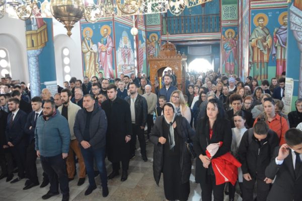 Саслуживали су архијерејски намесник крагујевачки протојереј-ставрофор мр Рајко Стефановић, ректор Богословије протојереј-ставрофор др Зоран Крстић, јереј Дејан Марковић, свештенство храма Светог Саве, професори Богословије Светог Јована Златоустог у свештеном чину и игуман манастира Тресија протосинђел Серафим. За певницом су појали богослови и Дечји хор „Свети Сава“.После читања јеванђелског зачала Владике, беседио је ректор Богословије протојереј-ставрофор др Зоран Крстић: