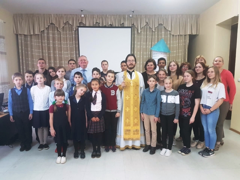 В тот же день священник Сергий Ким провел беседу с учащимися русской посольской школы, рассказав им о Христе, о Церкви и принципах христианской жизни в церковной общине.