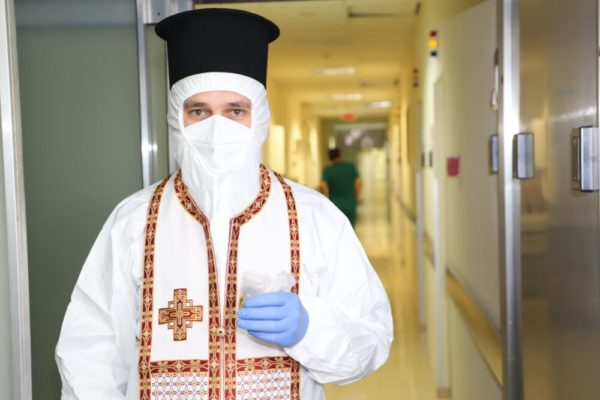 Свещенослужителите посетиха COVID-отделенията на ВМА, където помазаха с осветен елей и поръсиха със светена вода болните, лекарите и целия медицински персонал.