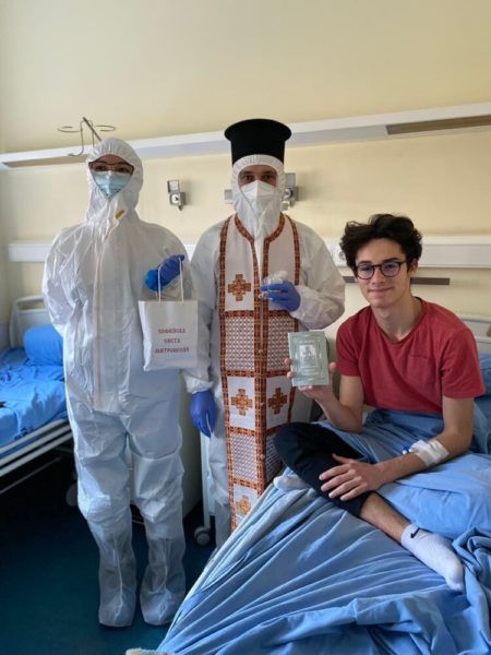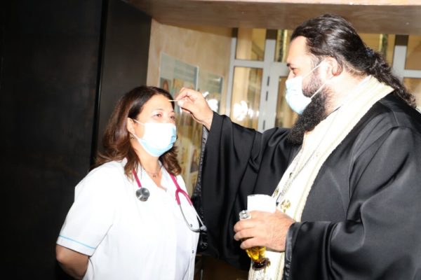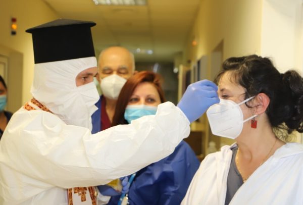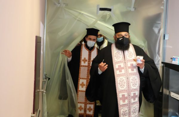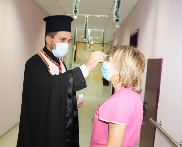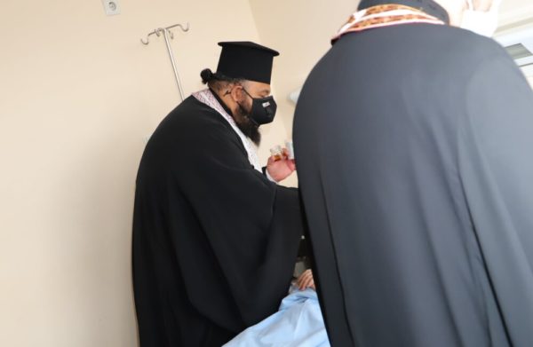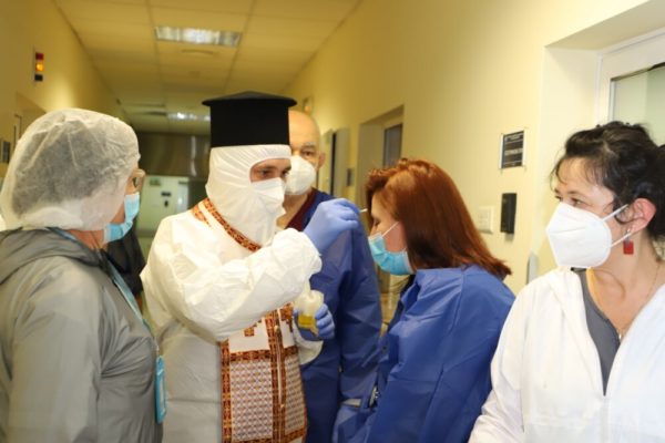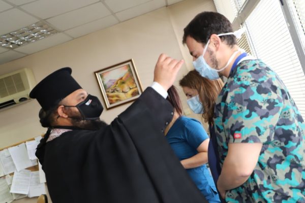 Свещенослужителите посетиха COVID-отделенията на ВМА, където помазаха с осветен елей и поръсиха със светена вода болните, лекарите и целия медицински персонал.